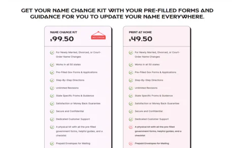 Choose between our Printed Kit in a Box, which includes a comprehensive name change kit that we ship to your address, or our Digital Kit, which is instantly downloadable so you can print it yourself.